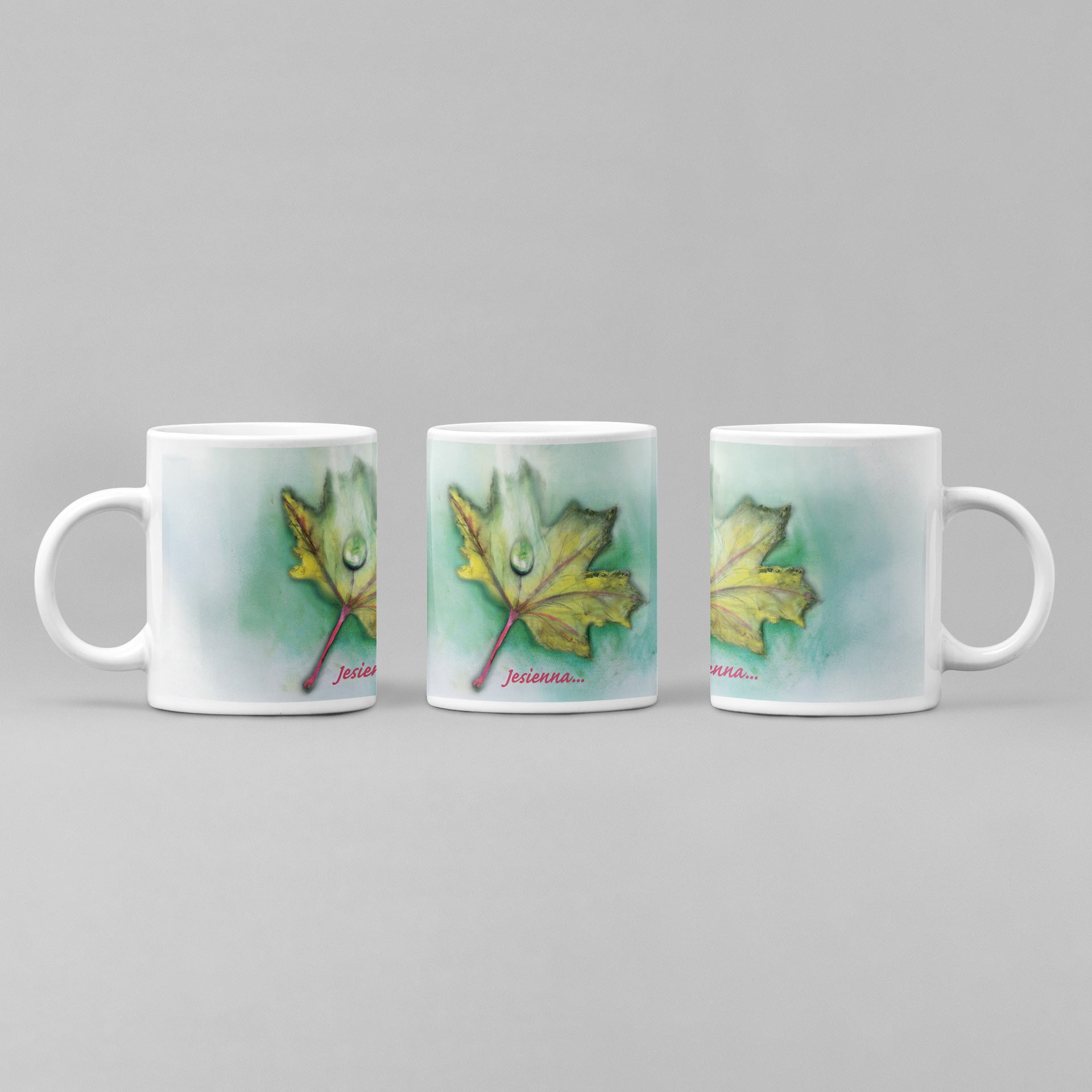 Delikatna grafika liścia klonu z kroplą rosy zdobi kubek inspirowany albumem „Jesienna…” Stanisławy Celińskiej. To obraz zatrzymanej chwili – melancholijnej, pełnej tęsknoty i spokoju. Symbolizuje jesienne refleksje, ale i ciepło, które można odnaleźć w muzyce artystki.