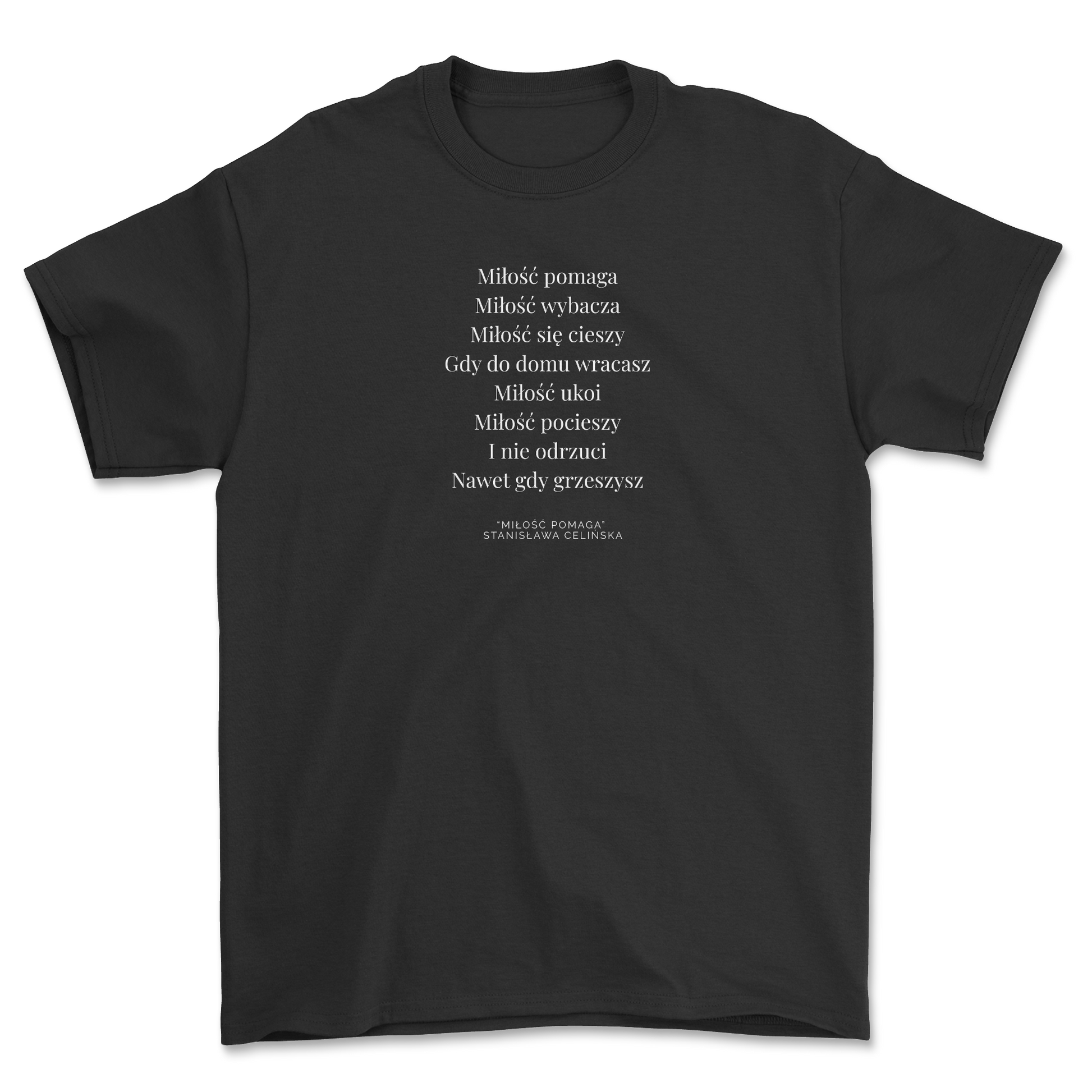 Koszulka z fragmentem utworu „Miłość pomaga” to hymn o sile miłości – tej, która wspiera, przebacza, cieszy się, koi i nie odrzuca nawet w chwilach słabości. Tekst, który znalazł się na koszulce, jest przypomnieniem, że miłość to najważniejsza z wartości – ponadczasowa i bezwarunkowa.